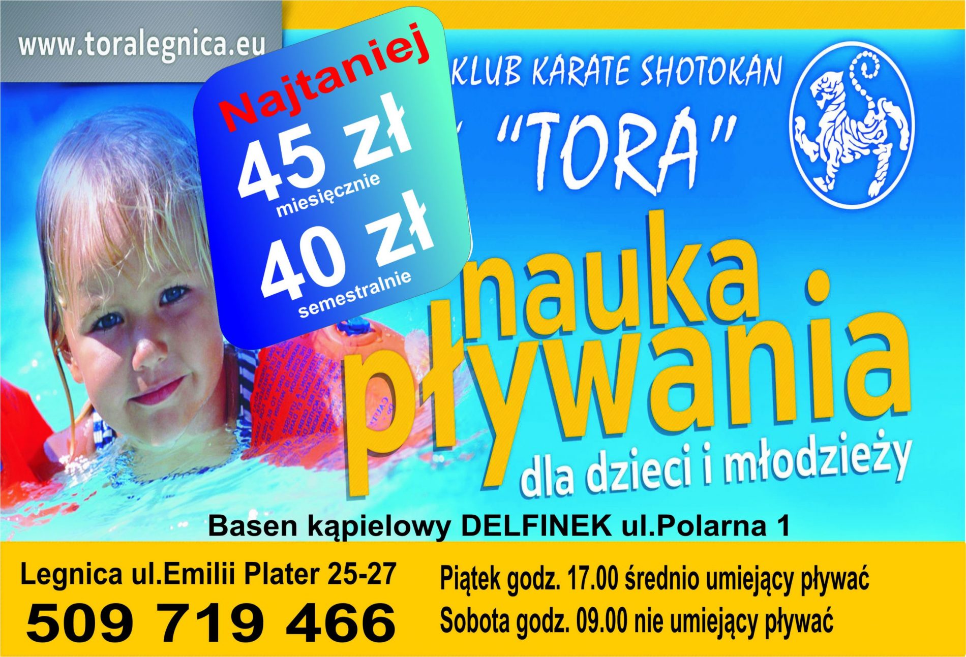NAUKA PŁYWANIA “TORA” – Basen Kąpielowy “DELFINEK ” Legnica ul. Polarna 1 ROK SZKOLNY 2025/2026- II semestr od 17.02.2026 do 25.06.2026 r. Miesiąc dzień i godzina Luty Marzec Kwiecień Maj Czerwiec Instruktor prowadzący Piątek 17:00 ilość zajęć.: 16 640,00 zł ( za cały … więcej